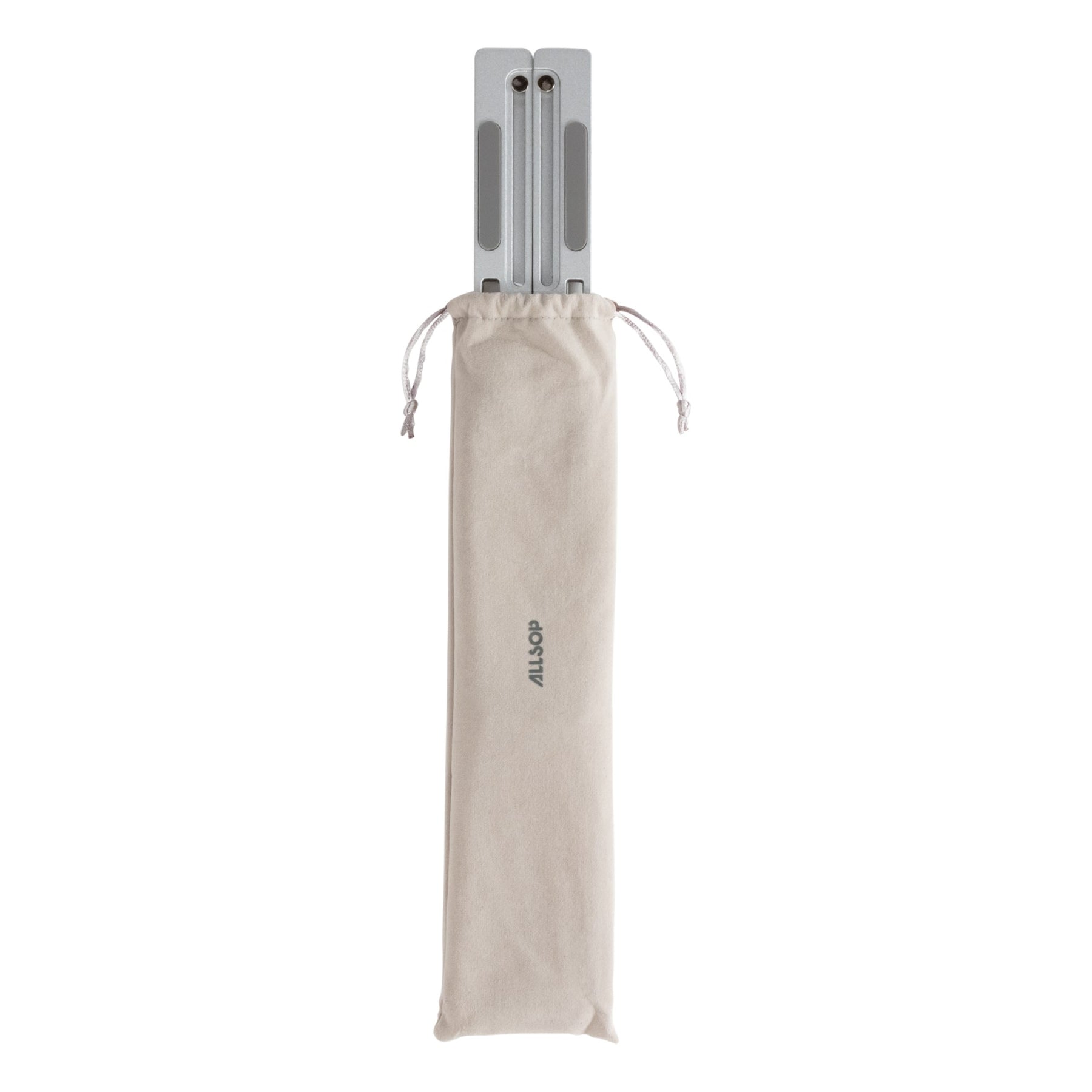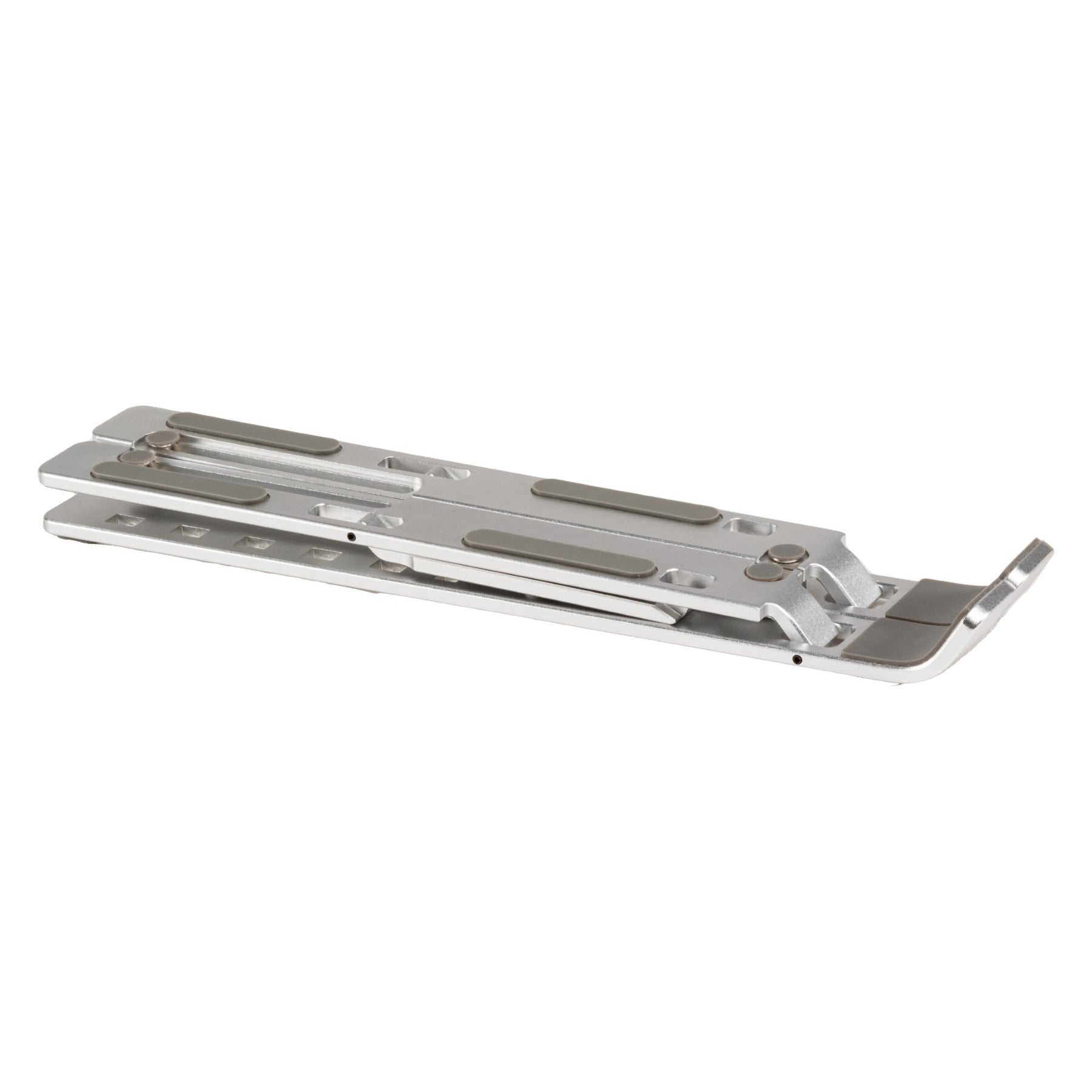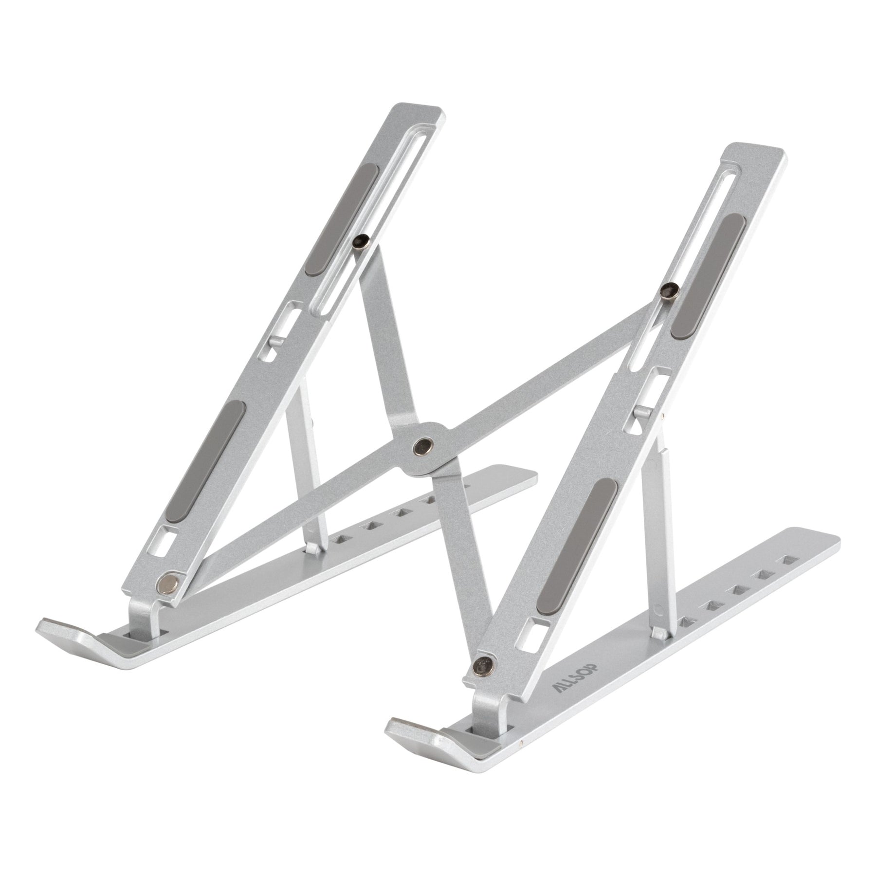 Raise your laptop to an ergonomic viewing height wherever you go with the Allsop Compact Aluminum Laptop Stand™. Made from aircraft-grade aluminum, this compact laptop stand features six adjustment levels to place your laptop or tablet at the perfect height and angle. Silicone pads on the arms and feet keep the stand and your laptop securely in place. The stand is less than 2” wide when folded for transport and comes with a convenient carry bag.